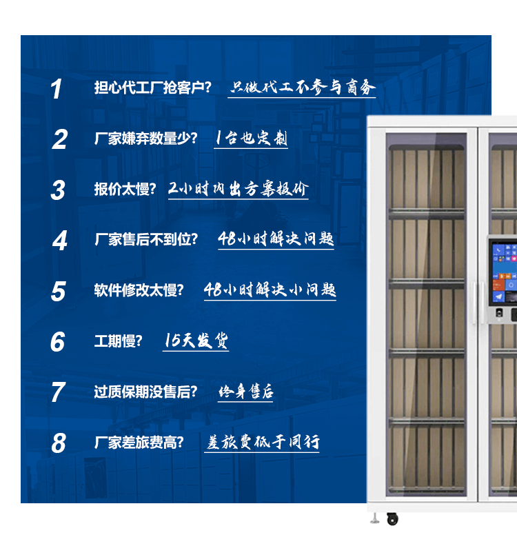 有15年管家式服務(wù)中間商的成熟經(jīng)驗。成熟產(chǎn)品有RFID智能柜、稱重柜、光敏柜、智能工具車、公檢法檔案管理柜。支撐軟件定制開發(fā)。